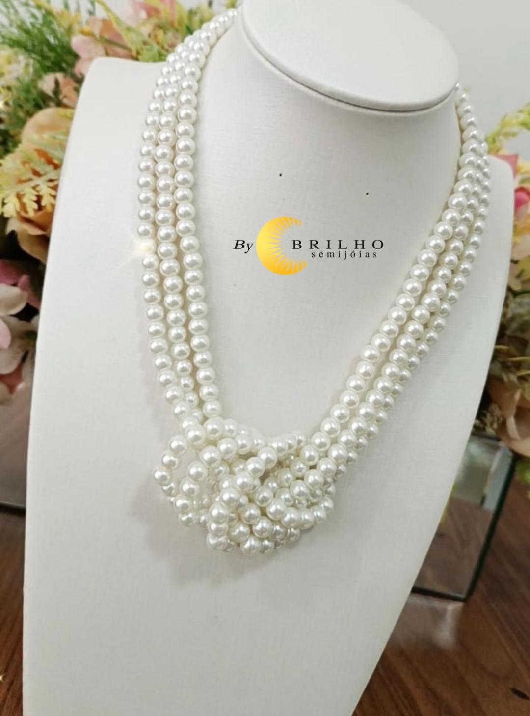 Colar (fecho lagosta com extensor) de pérolas shell com 3 voltas acabamento ródio branco (11307)