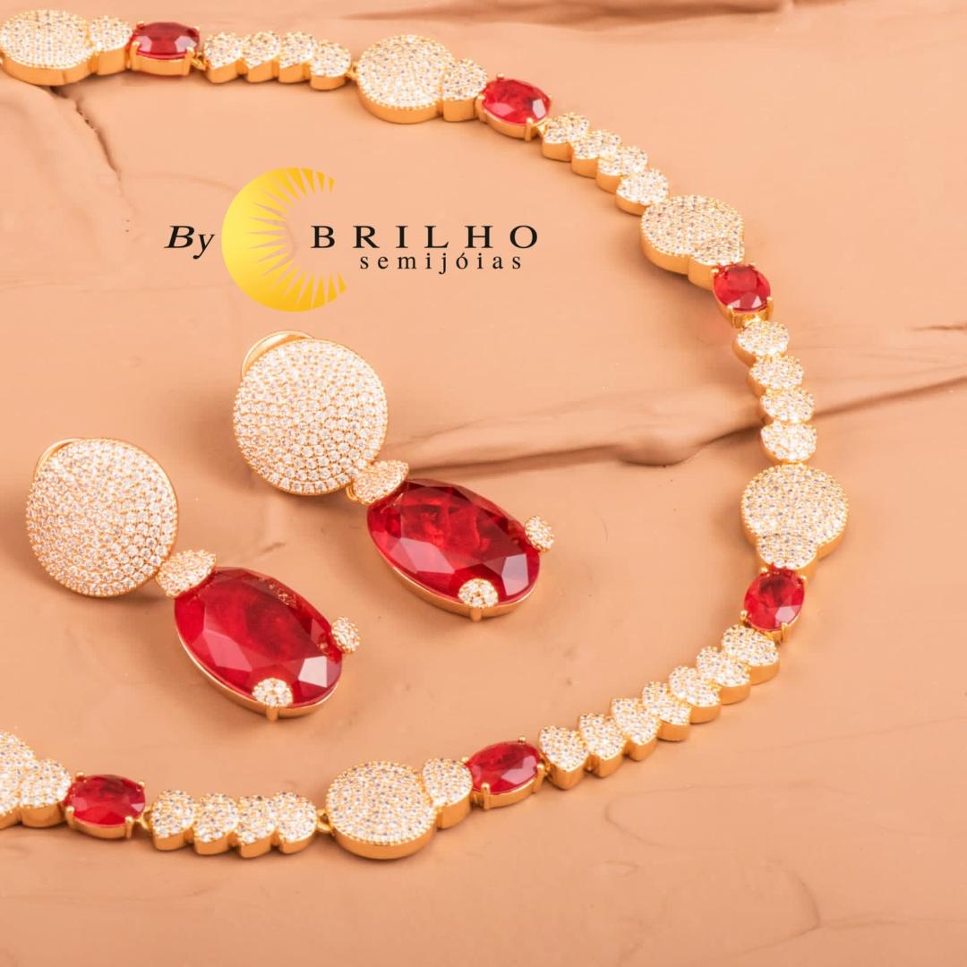 Conjunto de colar (fecho gravatinha) e brinco com zircônia e pedra rubi dourado (11284/10141)