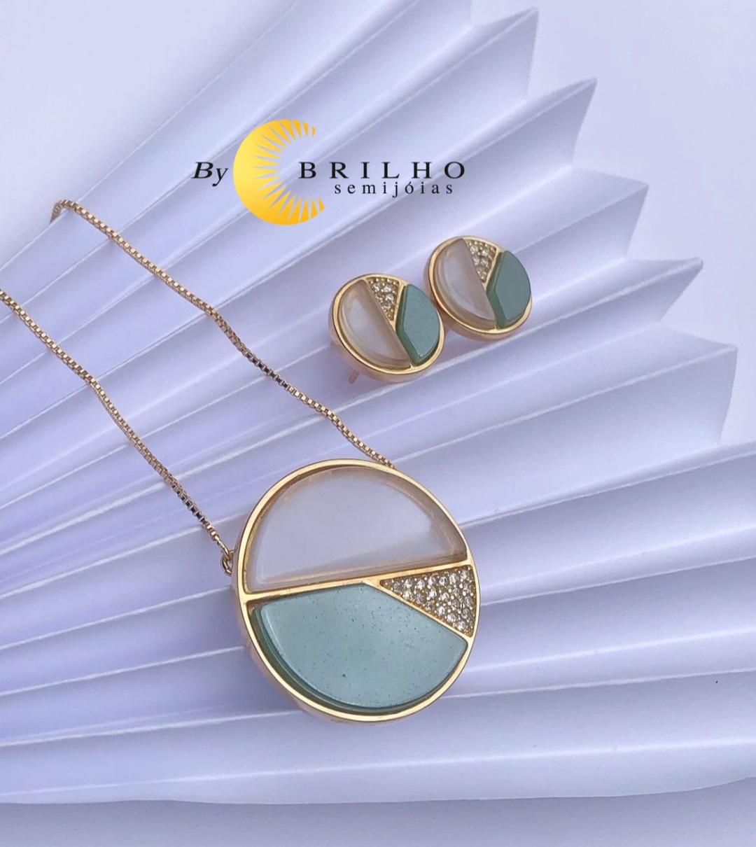 Conjunto de colar (fecho lagosta com extensor) e brinco de pedra cristal e aventurina com zircônia dourado (11068/10015)